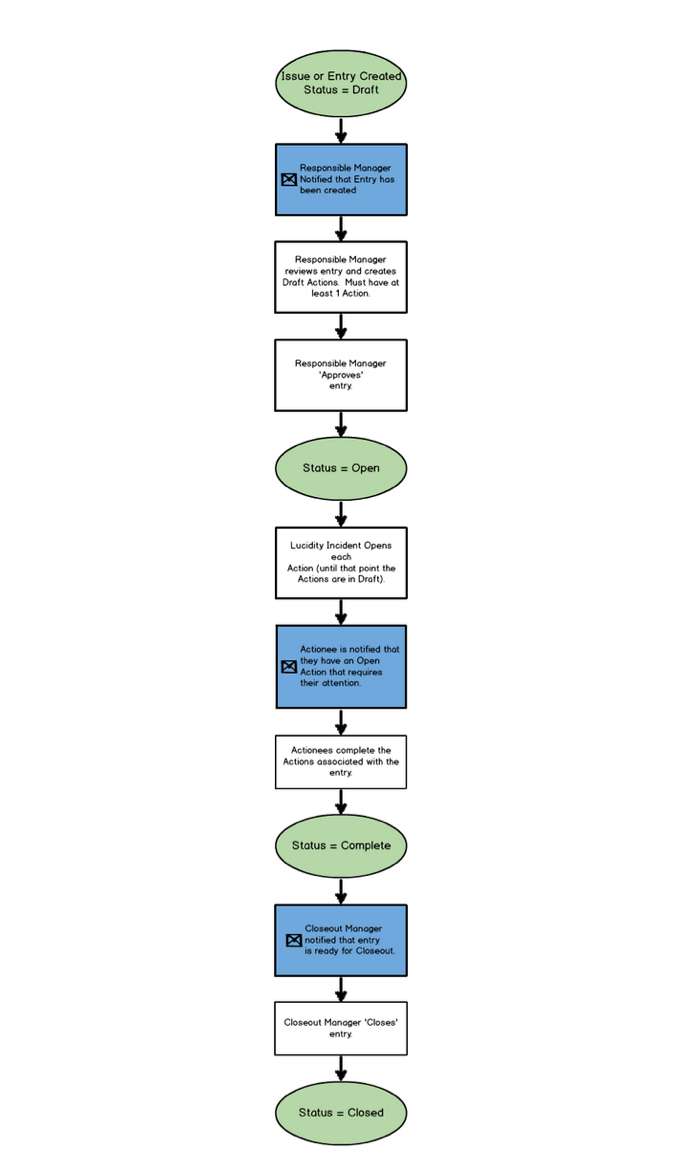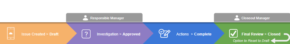| Draft | Issue created but not reviewed, investigated or approved by responsible manager | Not reviewed or investigated | In draft, not forwarded to actionees | Editable |