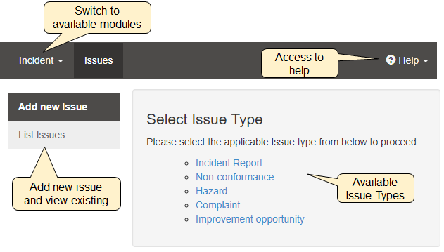 - Add New Issue: Lists available issue types. This is the central location to being a report of any type.