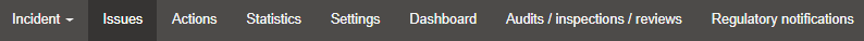 - Issues: The central tab where issues are raised, managed, closed and reported on.