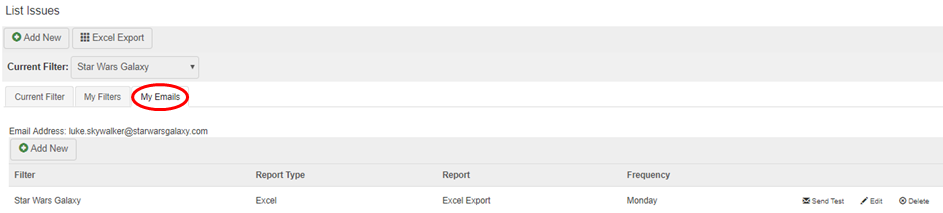 My Emails: Automatically emailed reports can be specified using the My Emails feature.