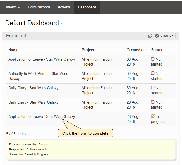 The Form List Widget on the Lucidity InForm Dashboard defaults to displaying all not started (assigned) and in progress forms for the logged in user.