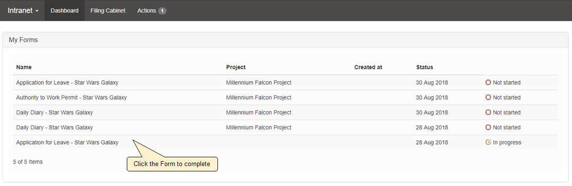 The My Forms section on the Lucidity Intranet Dashboard (default landing page) displays all not started and in progress forms for the logged in user.