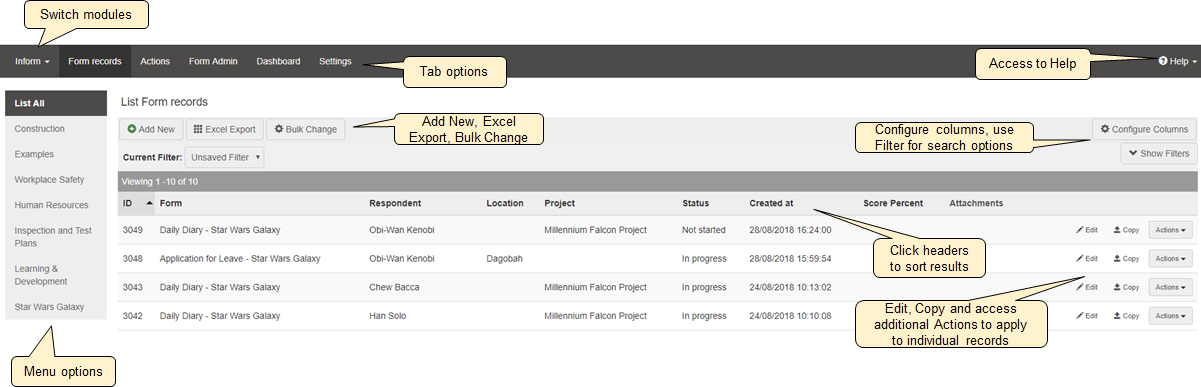 As with all Lucidity Software Modules, Lucidity InForm uses a series of tabs for basic navigation which are based on assigned permissions. Details on all these options are outlined in this user guide.
