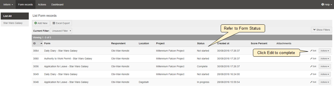 All forms will be listed on the default landing page in Lucidity InForm (the Form Records page), for all form status.