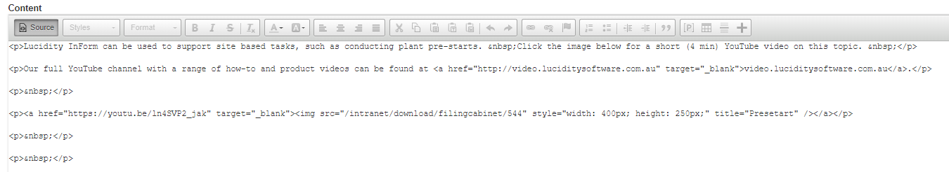 Lucidity Intranet's rich text editor empowers users to create visually appealing and engaging content with a suite of advanced styling tools and multimedia integration options. This guide will walk you through using the editor's formatting features, leveraging source code for precise control, and seamlessly incorporating text, images, and videos to create dynamic and informative intranet pages that effectively communicate your message.