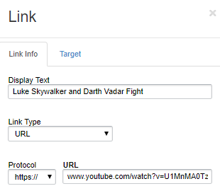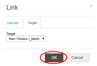 - Under the Target tab, choose how the link should open. Selecting New Window ensures the URL opens in a separate browser window each time it's clicked.