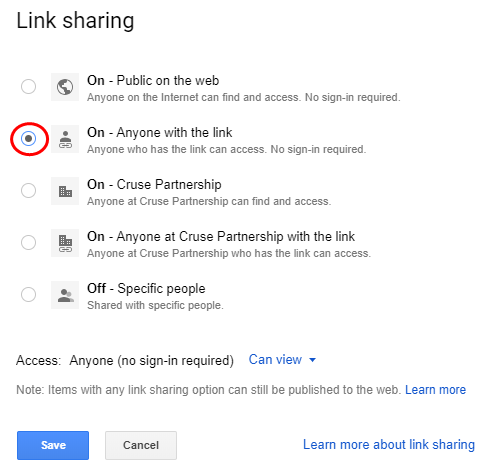 Files kept within online shared drives such as One Drive, Dropbox and Google Drive can be linked to the Management System. The instructions below outline how to share links from Google Drive. Refer to the specific shared drive instructions for details on how to share files.
