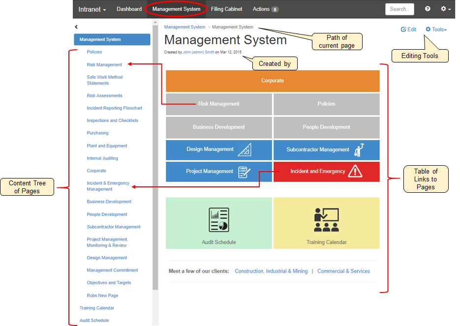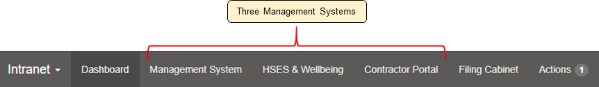 Multiple management systems can be utilised and access permissions restricted to various groups of employees, contractors etc. Each management system can have multiple pages, links and documents contained within them. Some examples of different uses of management systems and possible information and subpages to include are: