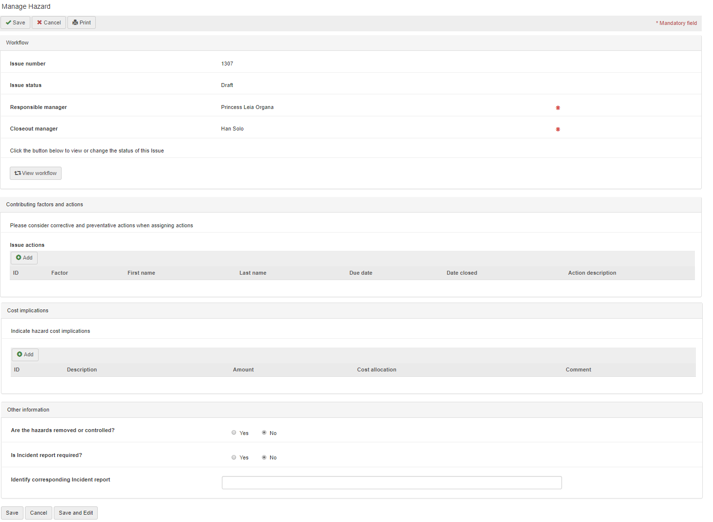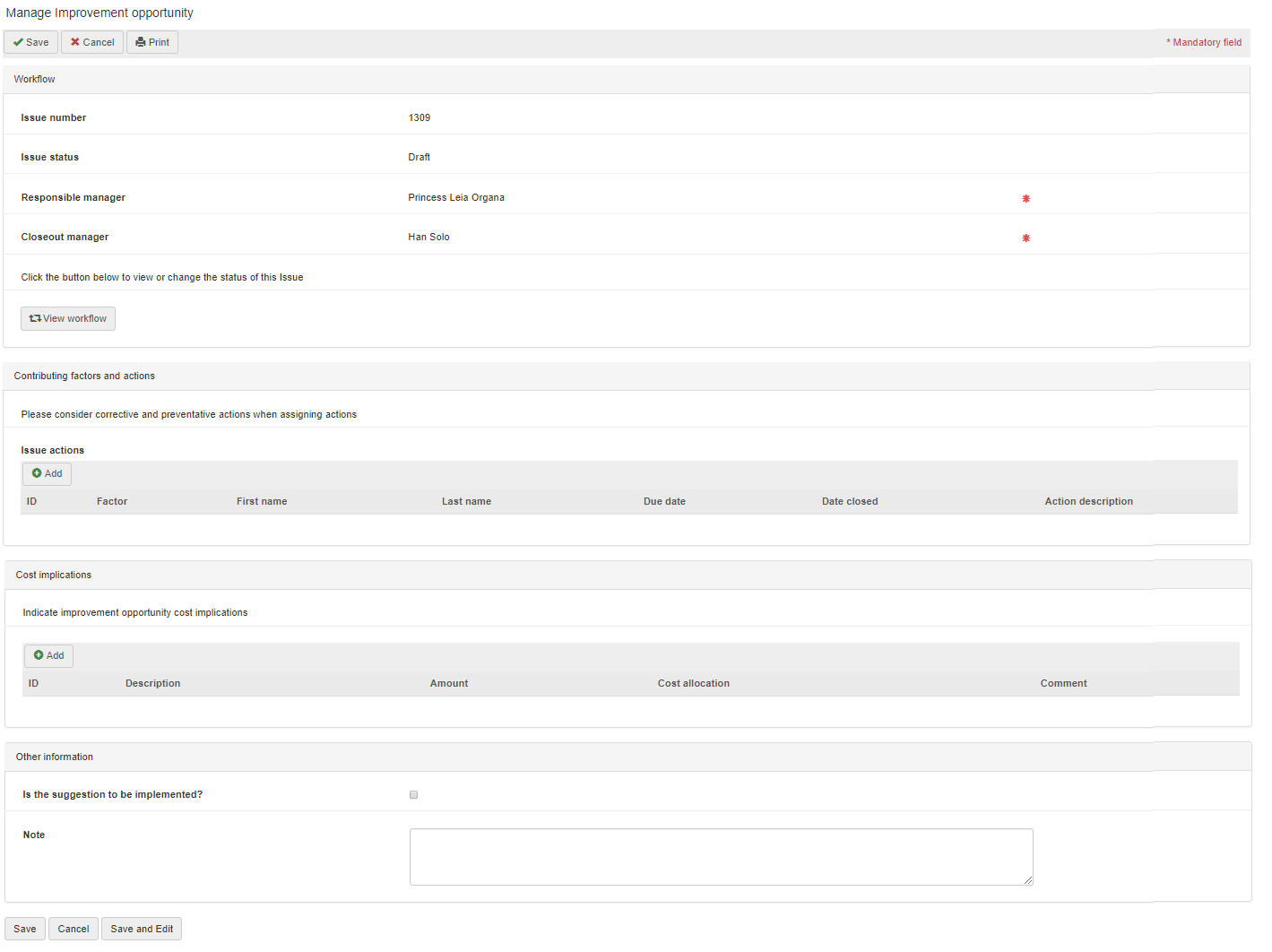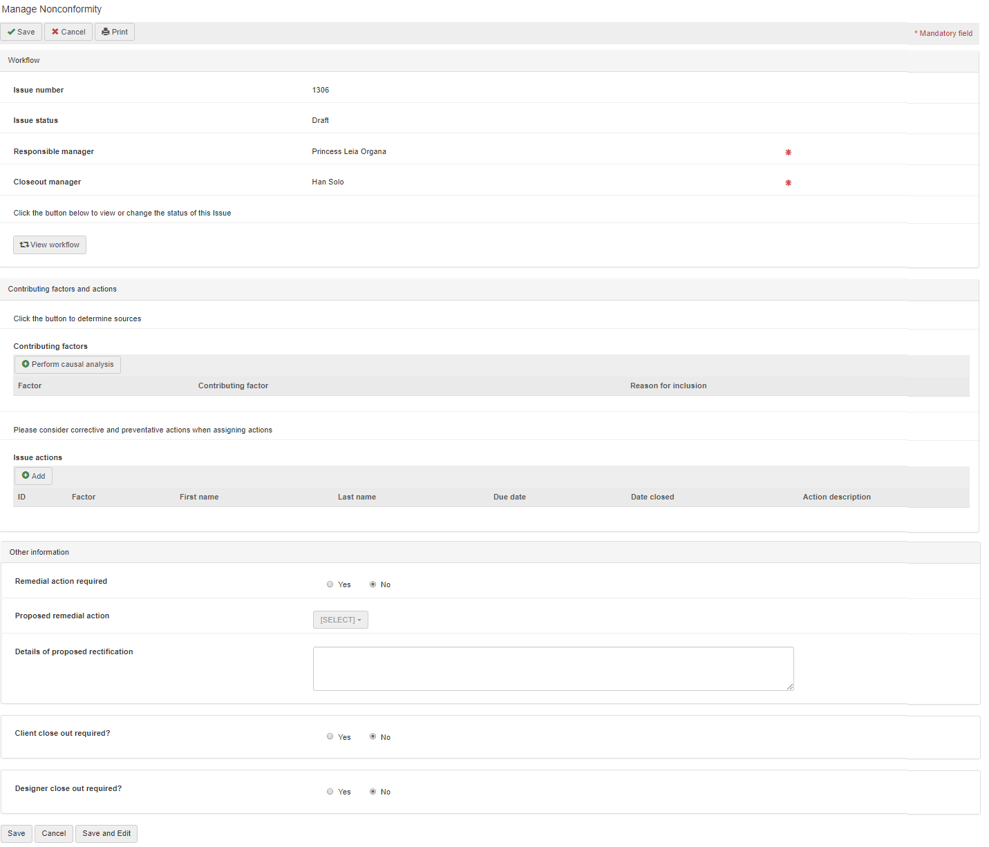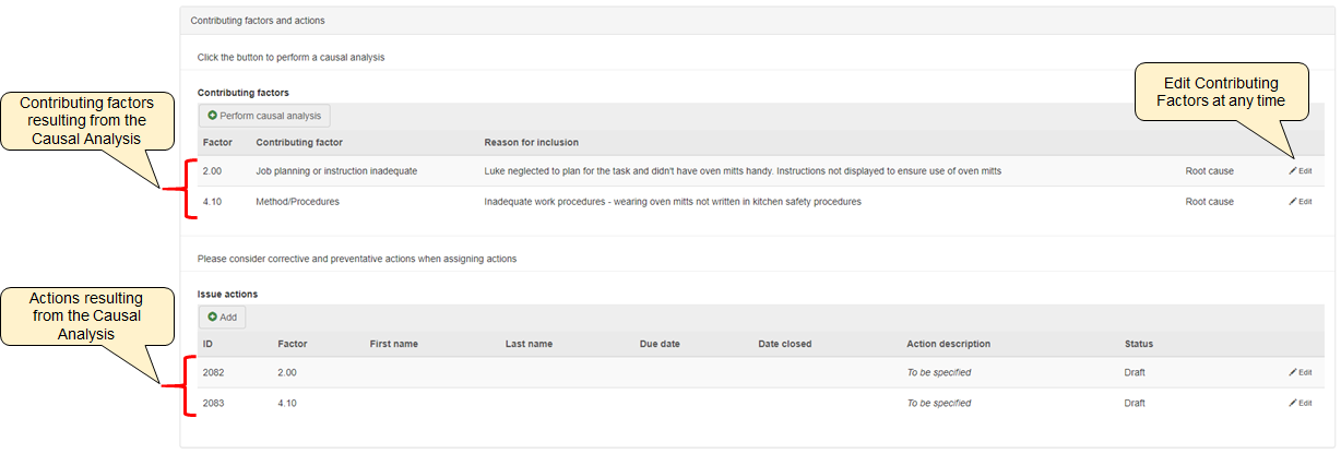Note: actions created as a result of the causal analysis do not include any actual action text or actionee. The action text, actionee and due date is entered by the person conducting the causal analysis. Refer to the Issue Actions section in this user guide below for more details.