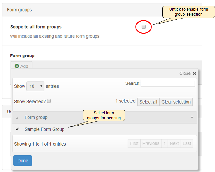 By default, the Scope to all form groups will be ticked, meaning all users in the role will have access to all forms.