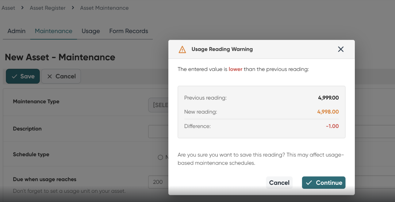 - Asset: Added a soft warning for asset maintenance usage to proactively alert users when entered value is lower than the previous reading